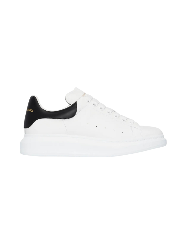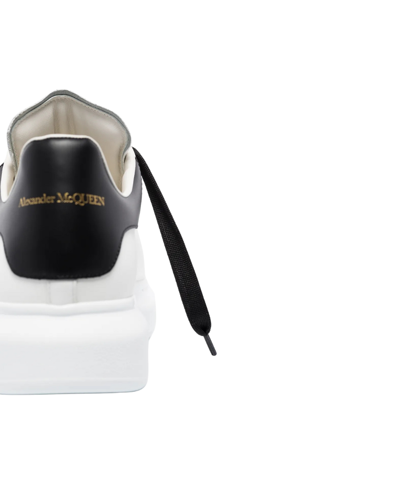 White smooth calf leather sneaker with rounded toe and tonal white heel panel. Perforated air holes, large flat laces and Alexander McQueen signature on tongue and heel. Leather lined. Tonal white oversized rubber sole.